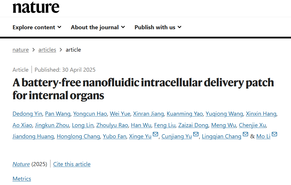2025年4月30日(北京时间),国际著名学术期刊《自然》(Nature)杂志在其官方网站上刊登了题为“A battery-free nanofluidic intracellular delivery patch for internal organs”的学术论文。该论文由北京航空...