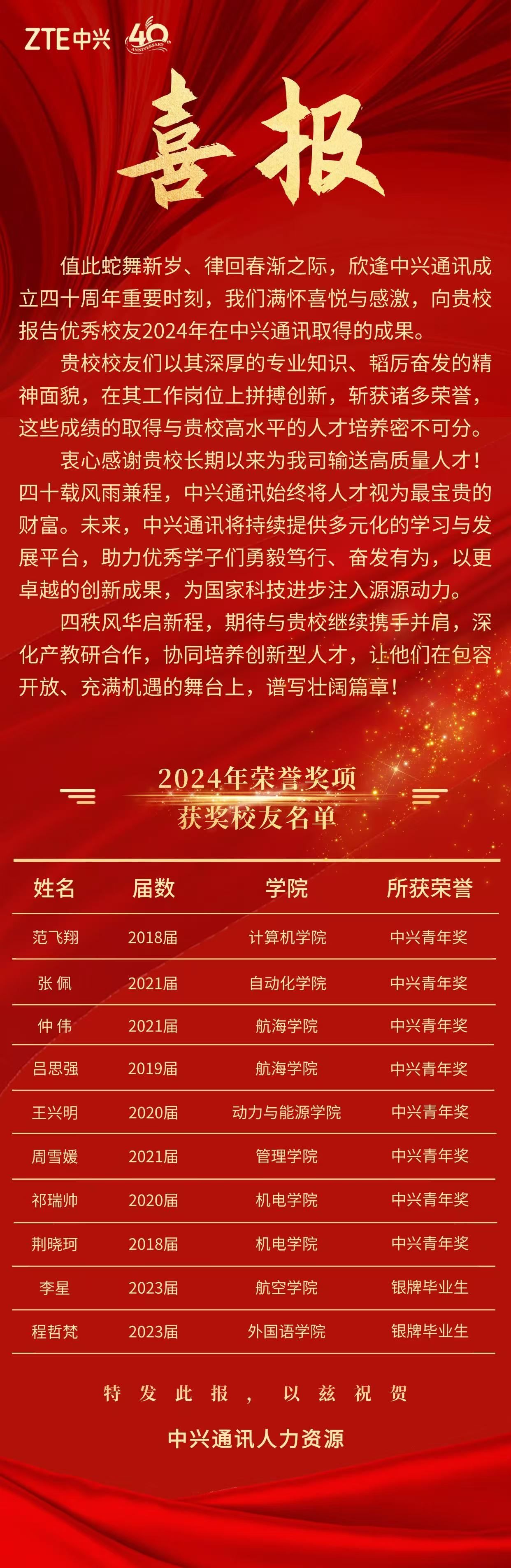 近日,中兴通讯向我校发来喜报,日韩无码 2018届硕士毕业生荆晓珂、2020届硕士毕业生祁瑞帅荣获“中兴青年奖”。此奖项是中兴通讯为毕业生颁发的最高荣誉之一,是公司对做出杰出贡献员工的认可与激励。获奖者经层层选拔、激烈角逐后,从数千名毕业生中脱颖而出,是公司未来发展的中流砥柱。荆晓珂,2015-2018年就读于机械设计及理论专业,现于中兴通讯从事无线基站的嵌入式软件开发工作。祁瑞帅,2017-2020年就读于机械工程专业,现...