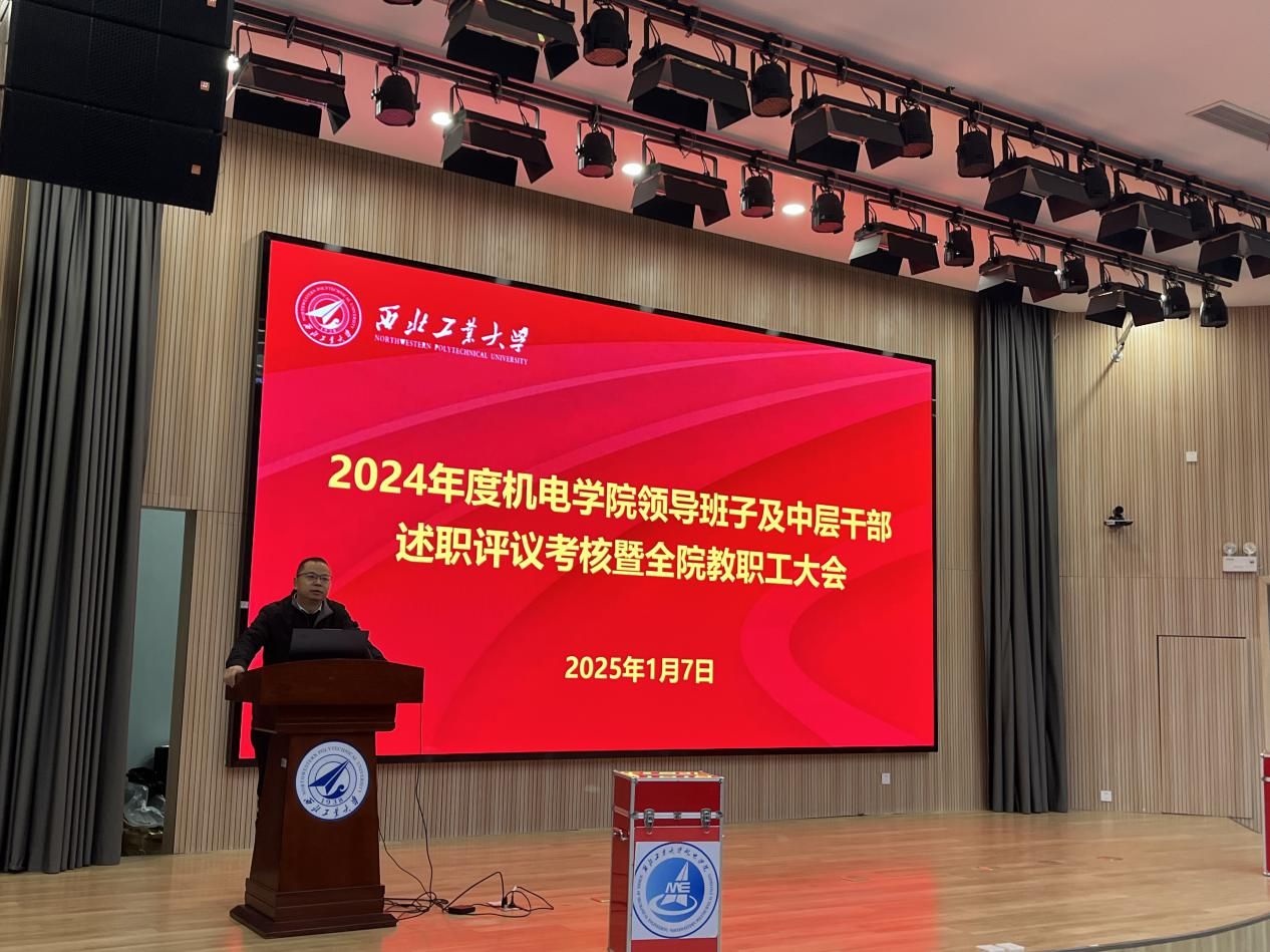 在航空楼环D报告厅召开2024年度领导班子及中层干部述职评议考核暨全院教职工大会,学院领导班子和全体教职工参加会议,会议由学院党委书记张映锋主持。
