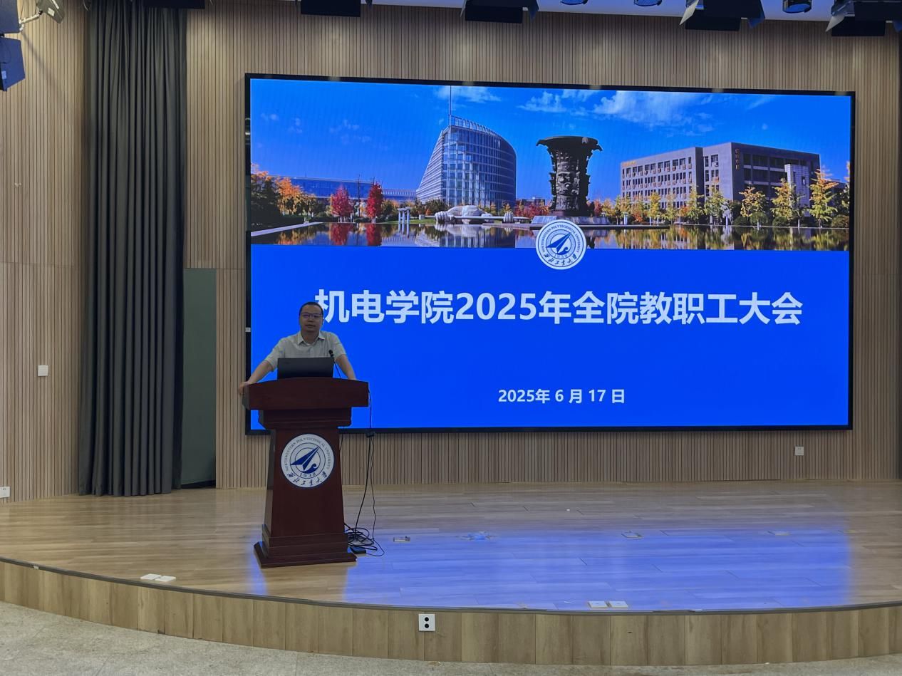 在航空楼环D报告厅召开全院教职工大会,大会邀请了学校人力资源部副部长林楠、招生办公室副主任马婷婷分别开展师德师风建设专题培训和招生工作培训动员,学院领导班子和全体教职工参加会议,会议由党委书记张映锋主持。