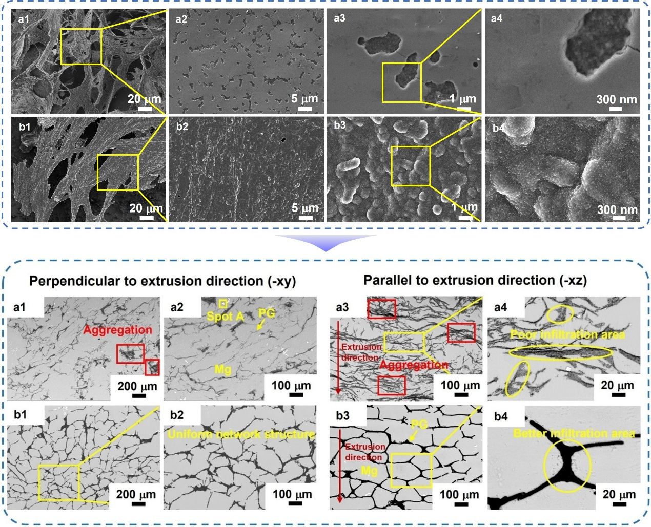 航空航天等领域对轻量化、小型化、集成化电子设备的需求日益扩大使得材料向着多功能的方向发展,兼具优异电磁屏蔽和力学性能的轻质材料成为目前发展的重要方向。石墨烯增强镁基复合材料具有轻质、高比强度和优异的导电性等优点,在航空航天等领域具有广阔的应用前景。然而,目前关于石墨烯增强镁基复合材料的研究所采用的增强体大多为氧化石墨烯和还原氧化石墨烯,存在增强体缺陷较多、石墨烯在镁基体中未形成良好的三维连通性、浸渗挤压制备成镁基复合材料难度大等问题,这就导致复合材料电磁屏蔽-力学等综合性能协同提升受限。
