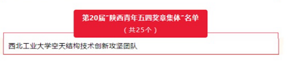 教师朱继宏担任负责人的空天结构技术创新攻坚团队荣获“陕西青年五四奖章集体”。本届评选为西工大青年教师团队首次获得集体奖章。