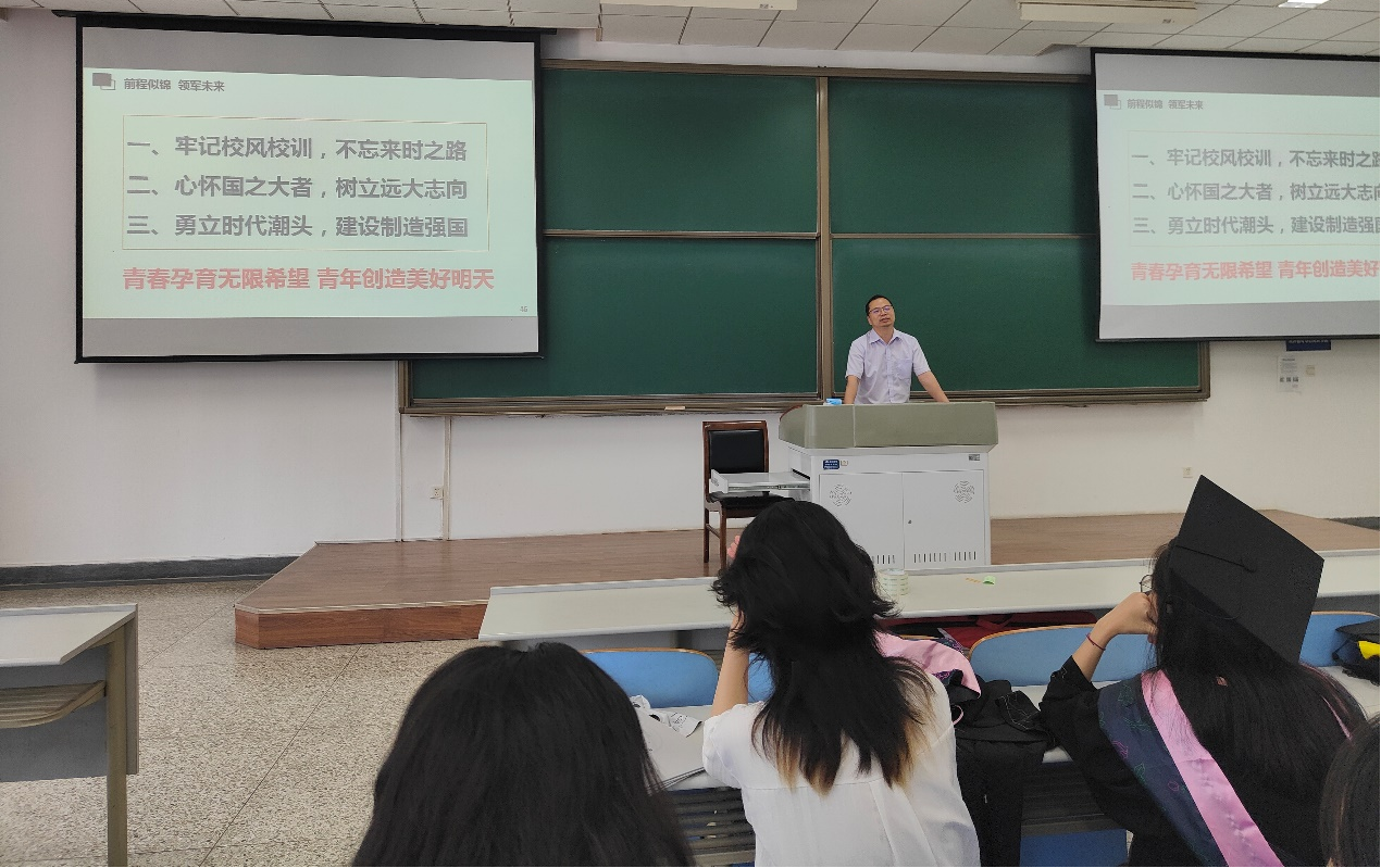 从学院发展、科研成果出发,书记与同学们一同回顾四年来学院的进步与学子们的生活点滴,师生济济一堂。最后,书记表达了对毕业生的美好祝愿,鼓励同学们向追求卓越的优秀院友学习,牢记公诚勇毅的校训,践行三实一新的校风,始终有骨气、有志气、有底气,始终不忘来时之路,心怀国之大者,树立远大志向,勇立时代潮头,始终用中国精神引领人生航向,为建设制造强国奋勇前进,以优异的成绩迎接党的二十大胜利召开。