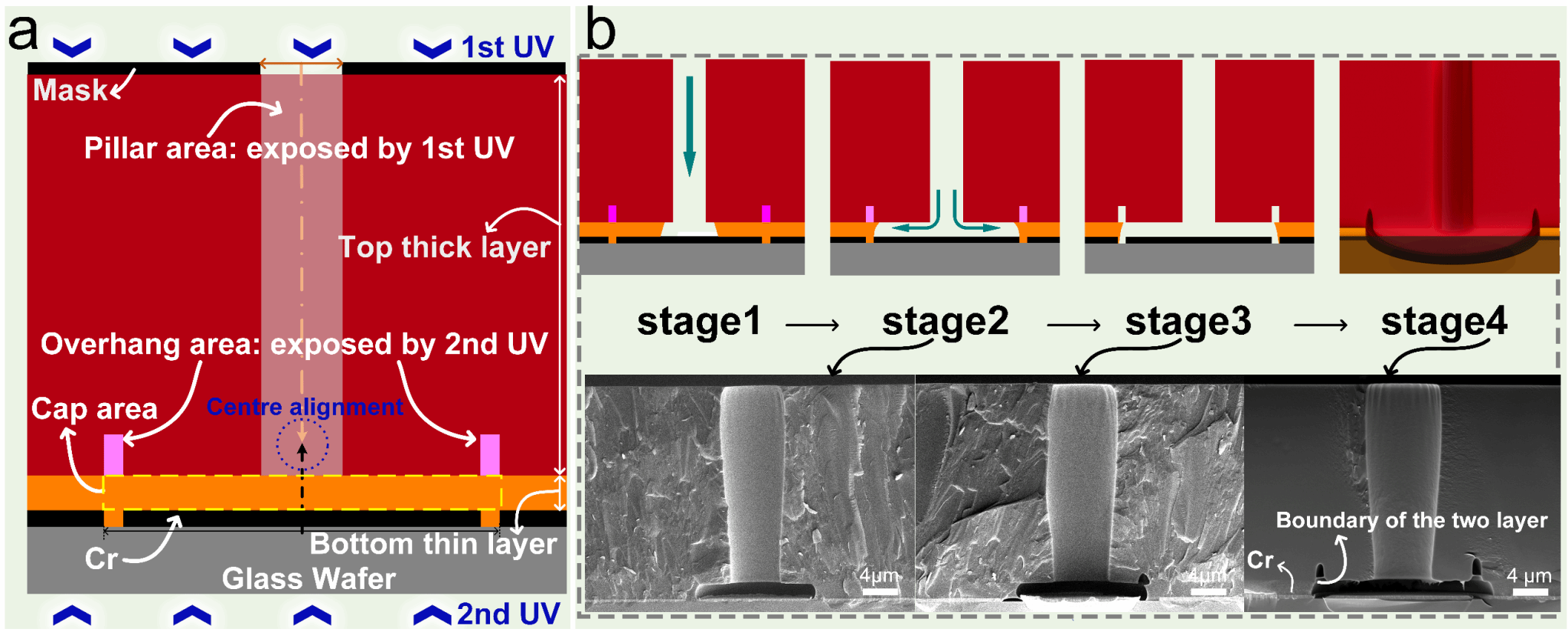 图4 (a)双凹型微结构光刻胶模具制备原理的示意图;(b)双凹型微结构光刻胶模具显影过程示意图及对应的SEM截面图