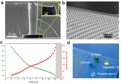 (c)双凹型微纳结构表面最大突破压力测试图;(d)双凹型微纳结构表面排斥不同液体