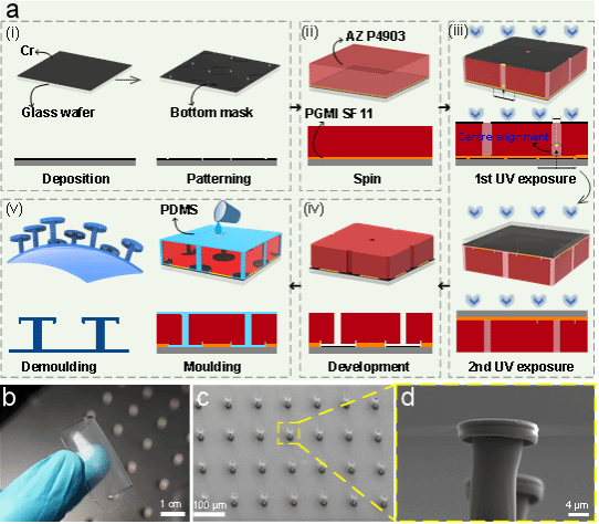 马炳和教授课题组通过光刻曝光精细设计,结合MEMS双层光刻剥离工艺,首次在双层光刻胶中获得了双凹型微结构空腔(图4),利用一步微复制工艺(图5)得到了PDMS(聚二甲基硅氧烷)基仿生柔性双凹型微阵列表面。本方案较目前已有的柔性双凹型微结构制备方法较大优势:双凹型微结构的垂直悬垂腔直接在光刻胶模具中一步浇筑获得,相应的聚合物基微结构具备高稳定性;基于光刻及光刻胶模具的加工方法可获得较大面积的柔性微结构表面,加工效率高,增强了实用性。