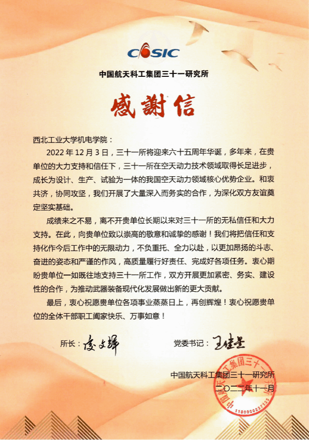 张卫红院士研究团队收到了来自中国航天科工集团三十一所,署有凌文辉所长和王继星书记亲笔签名的感谢信。这不仅是对我校科技工作者科研攻关能力的高度认可,也是我校科技工作者在推动国防工业现代化发展道路上踔厉奋发的最好见证。