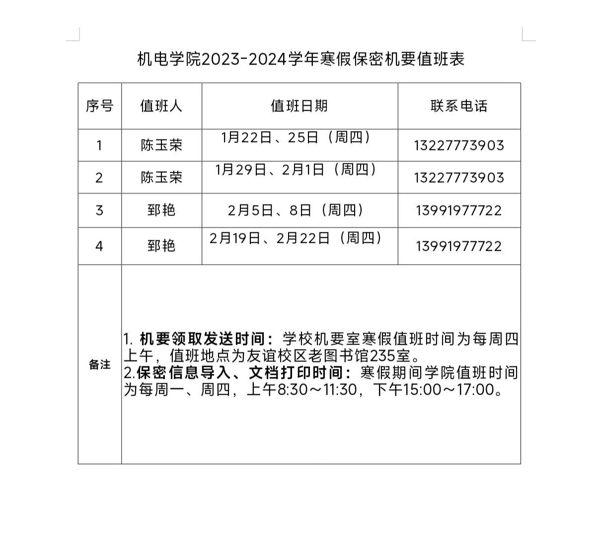 日韩无码 2023-2024学年寒假保密机要值班表