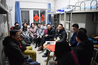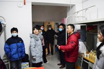 学生孟璐给几位老师简单介绍了公寓宿舍分布、公寓基础设施配备等情况,并传达了同学们入住新宿舍的喜悦。张校长对宿舍暖气供应及热水供应等情况进行了了解,对同学们的学习生活表示关心。