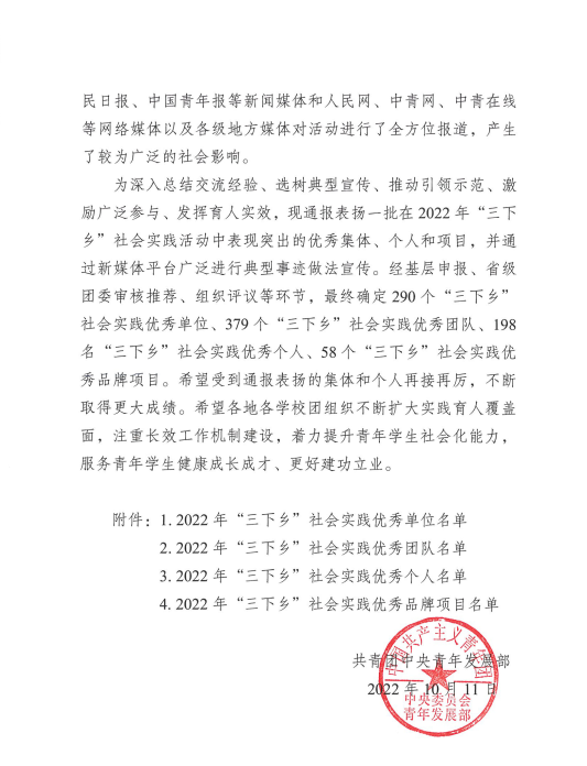 为深入总结交流经验选树典型宣传推动引领示范激励广泛参与发挥育人实效 20221012,中国共产主义青年团中央委员会发文,通报表彰2022年全国大中专学生志愿者暑期文化科技卫生“三下乡”社会实践活动表彰结果。日韩无码 团委获评2022年“三下乡”社会实践优秀单位,日韩无码 “追火箭的年轻人”实践队获评2022年“三下乡”社会实践优秀团队。