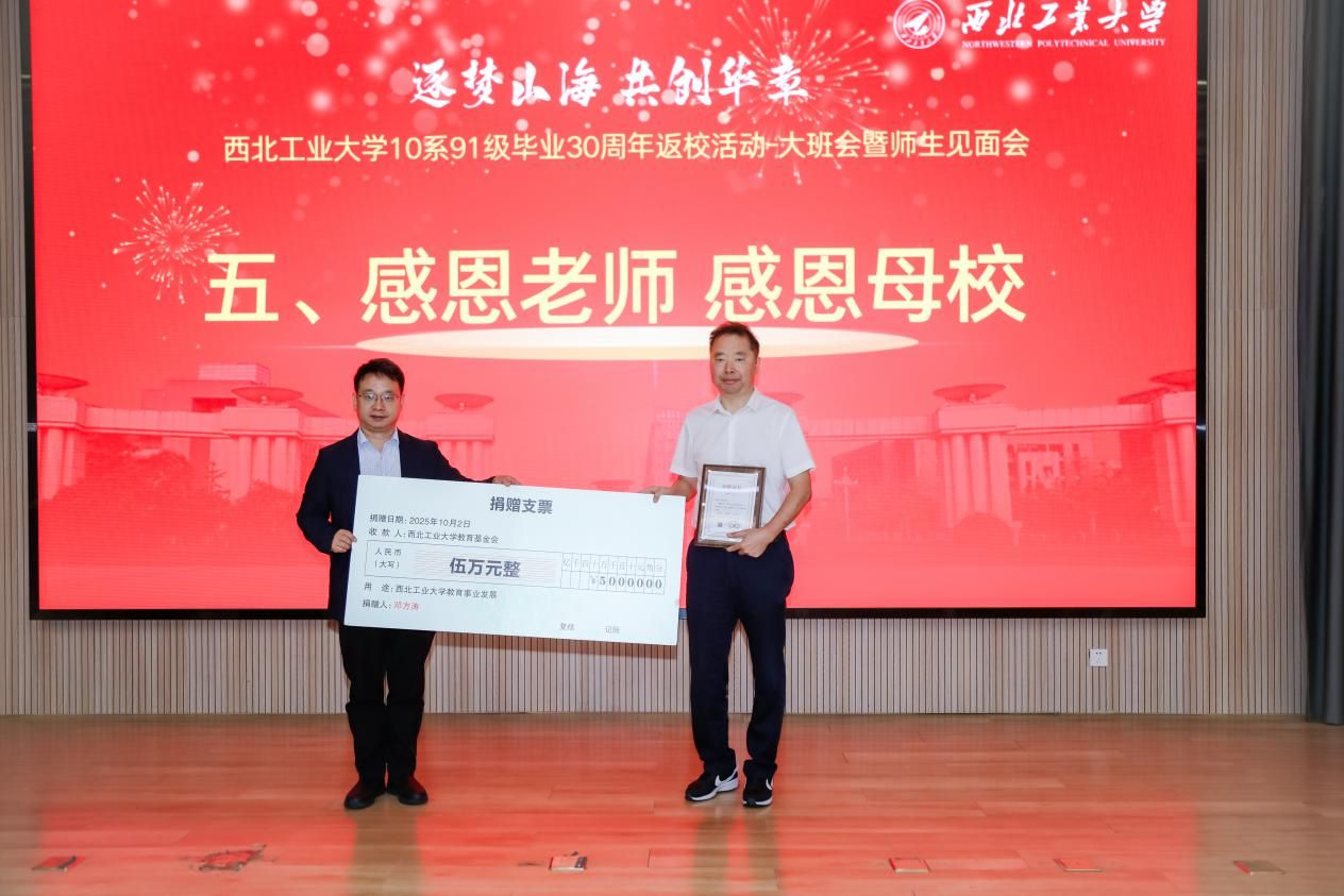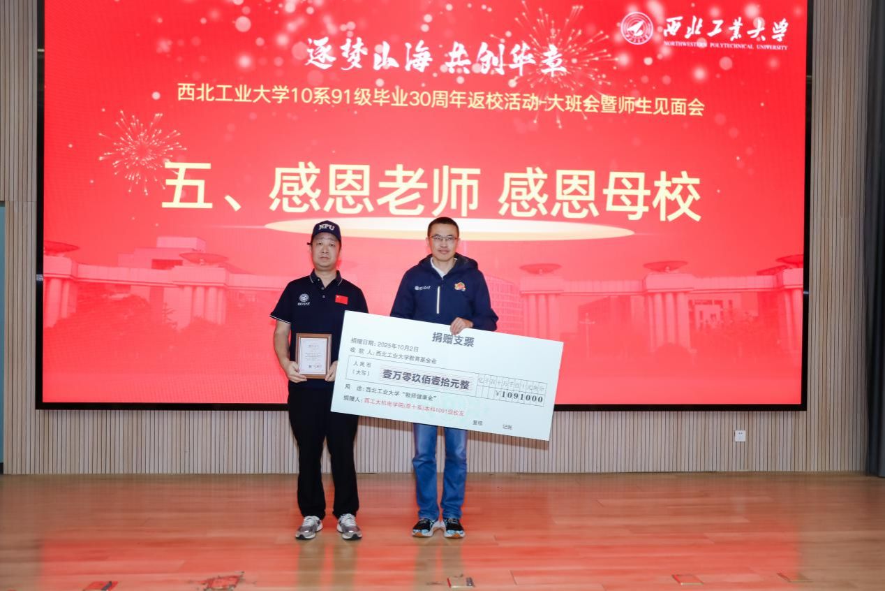 院长常洪龙在会上为校友们介绍了近年来学院的发展与取得的成就,并诚挚邀请广大校友常回家看看,继续关注支持母校的发展建设。91级代表教师,辅导员和返校同学也纷纷上台发言,深情回顾往昔岁月,讲述难忘师生情谊,现场气氛温馨动人。会上还举行了捐赠仪式,1091级校友邓方涛个人向学校教育基金会捐赠人民币5万元,全体1091级校友共同捐赠人民币1.091万元,象征全体1091级学子的共同心意,杨铭代表校友基金会接受捐赠。此笔款项将专项用于“教师健康金”,凝聚了校友们感念师恩、心系母校的深厚情谊。