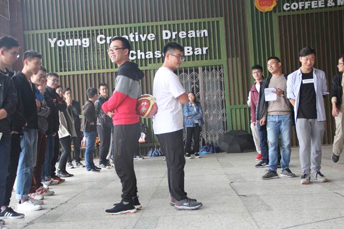 最后进行的是双龙戏珠。背对的两人中间夹个篮球,进行接力比赛。非常简单的形式,却最考验同学之间的默契。一旦在行进过程中有些微错位,就会形成恐怖的正反馈,直到两位同学以各种扭曲的姿势到达终点。