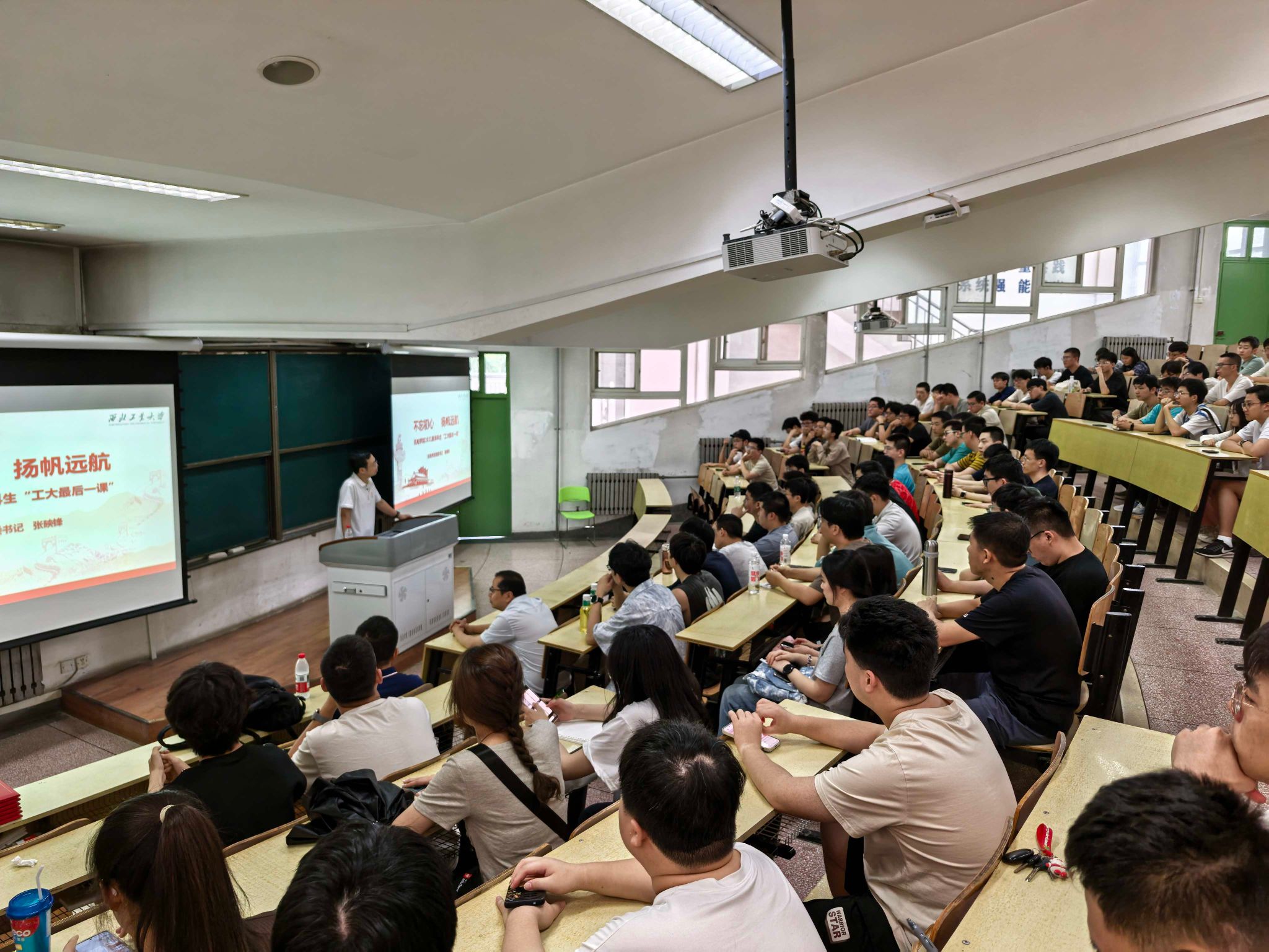 党委书记张映锋教授以 “不忘初心,扬帆起航” 为主题,为毕业生讲授 “工大最后一课”。学院党委副书记高峻,学生党务负责人曾文出席会议。