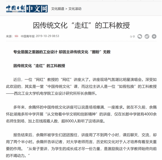 5.4.7【中国青年报】专访因传统文化“走红”的工科教授-余隋怀